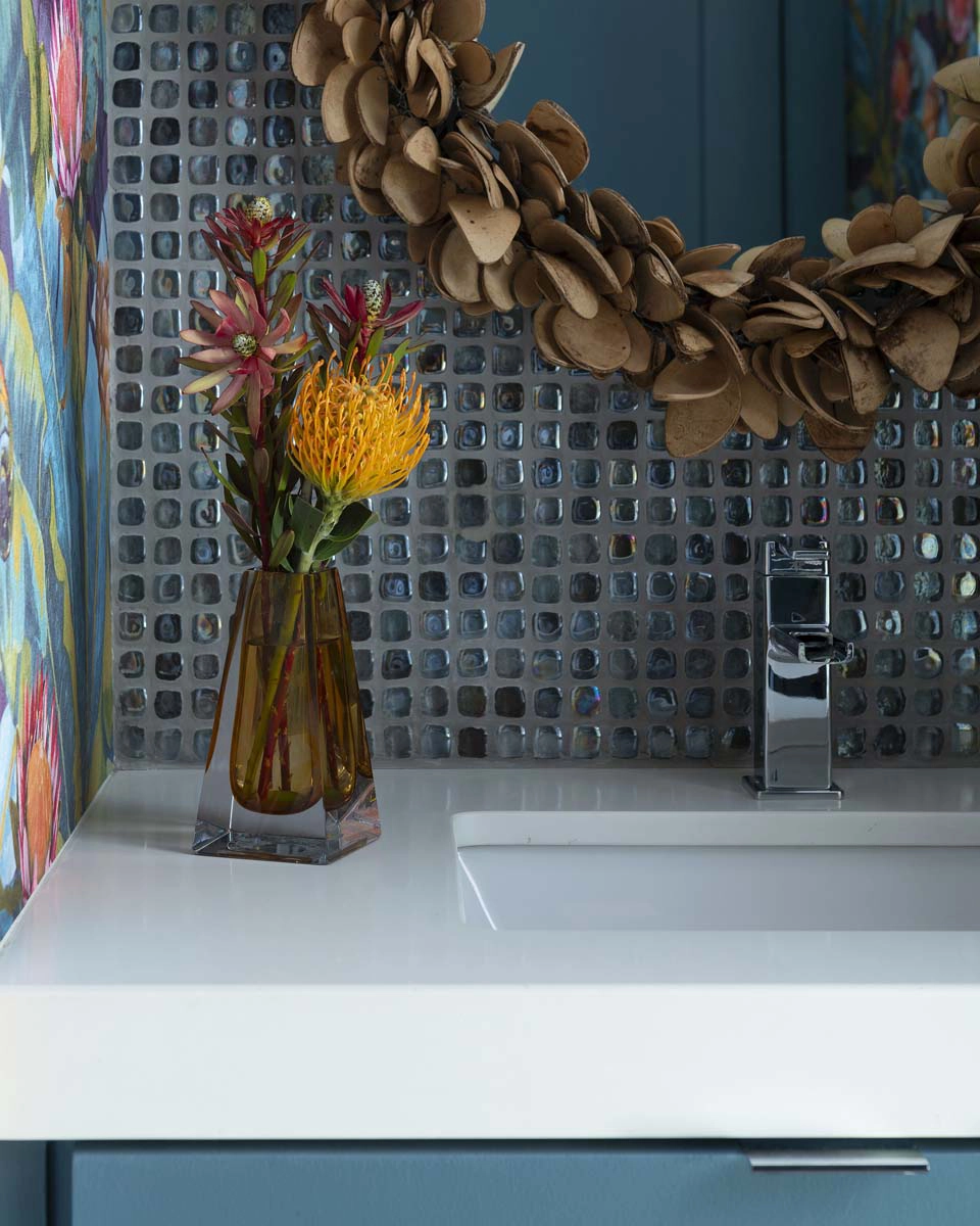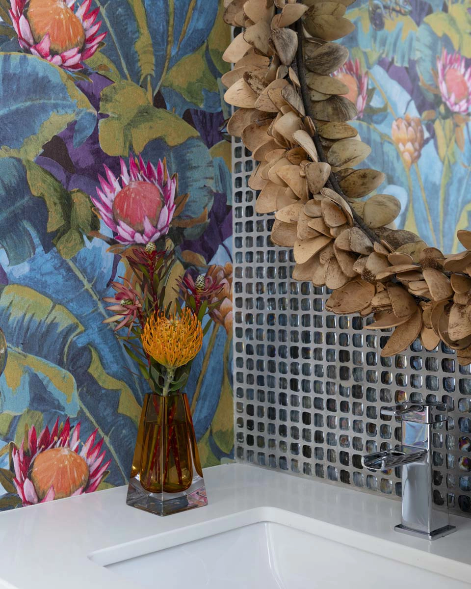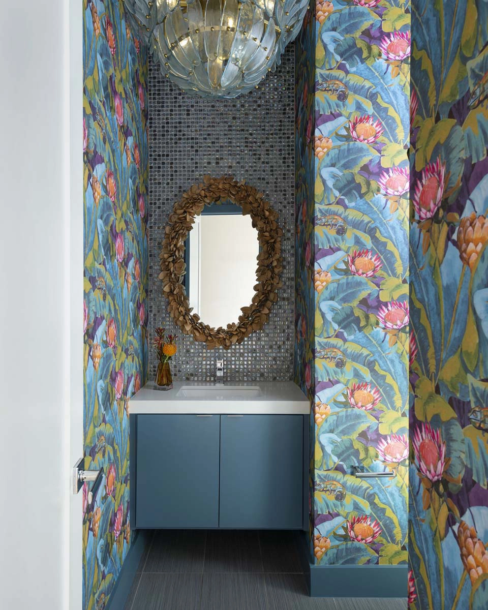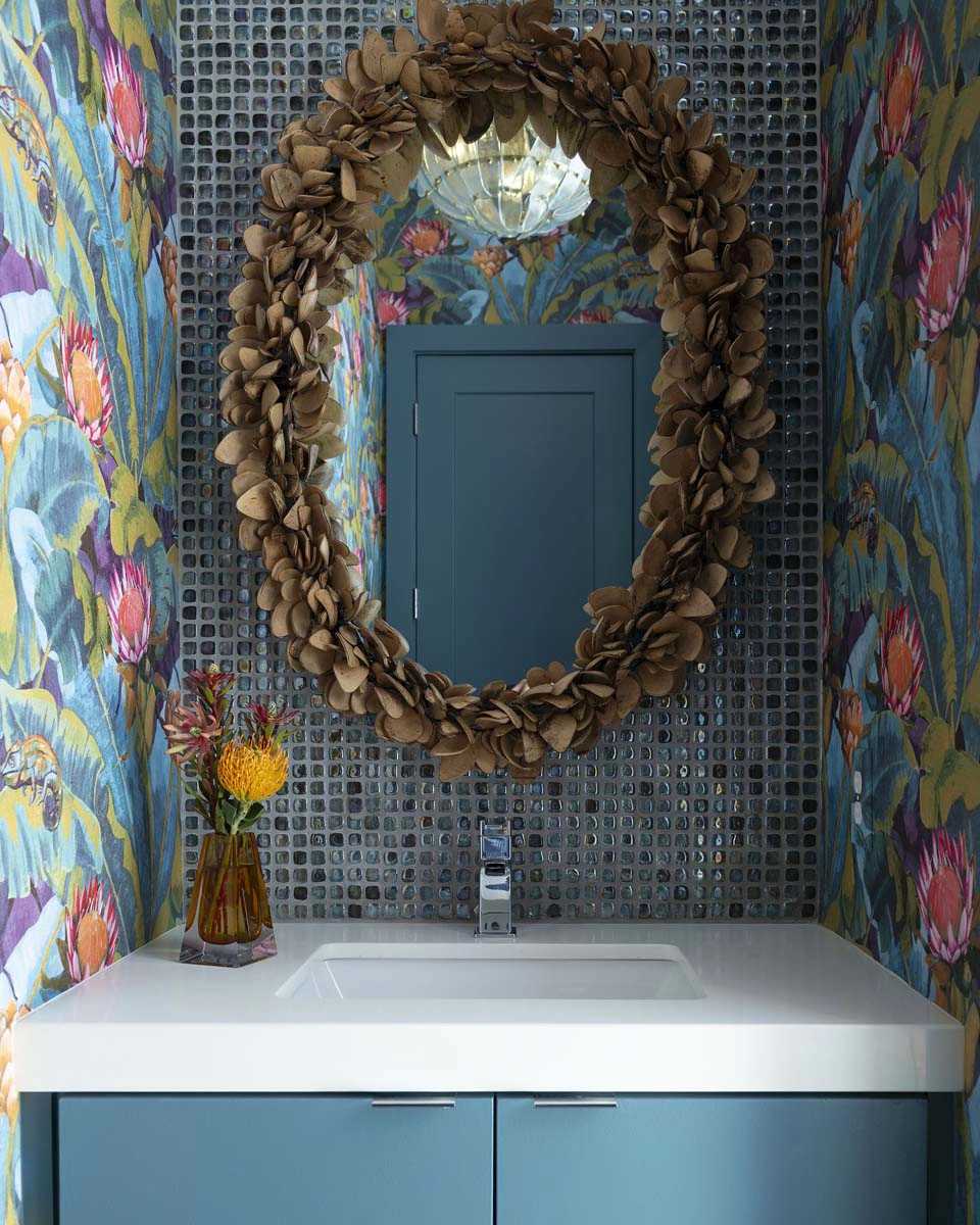We leaned into this vision with bold, joyful design moments throughout the home. The powder bath sets the tone with a dramatic floral wallcovering, complemented by a bottle-glass chandelier and a coconut shell vanity mirror—an immersive nod to island style.