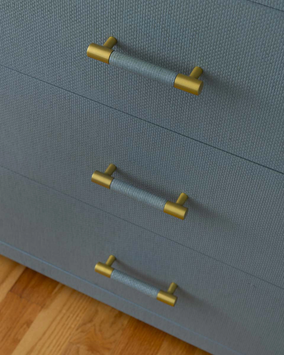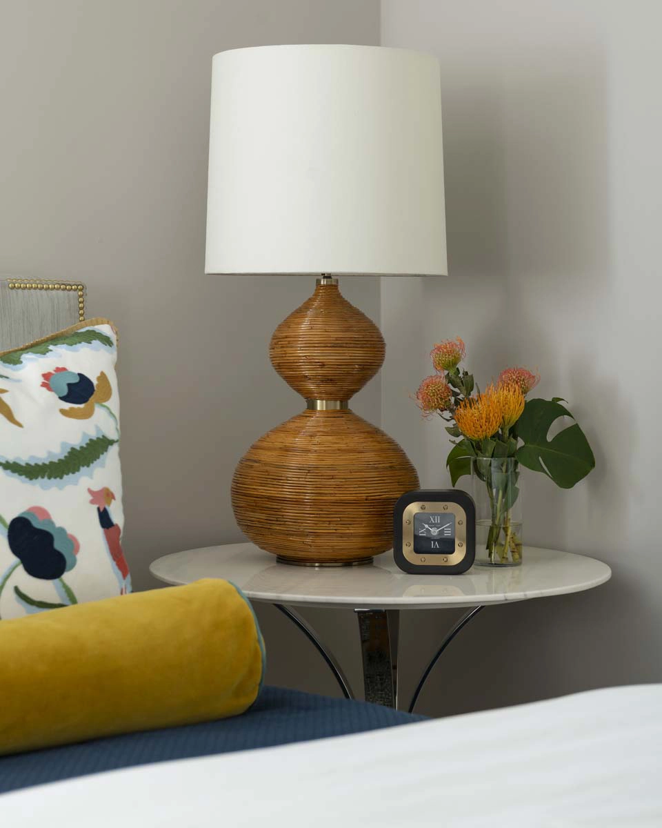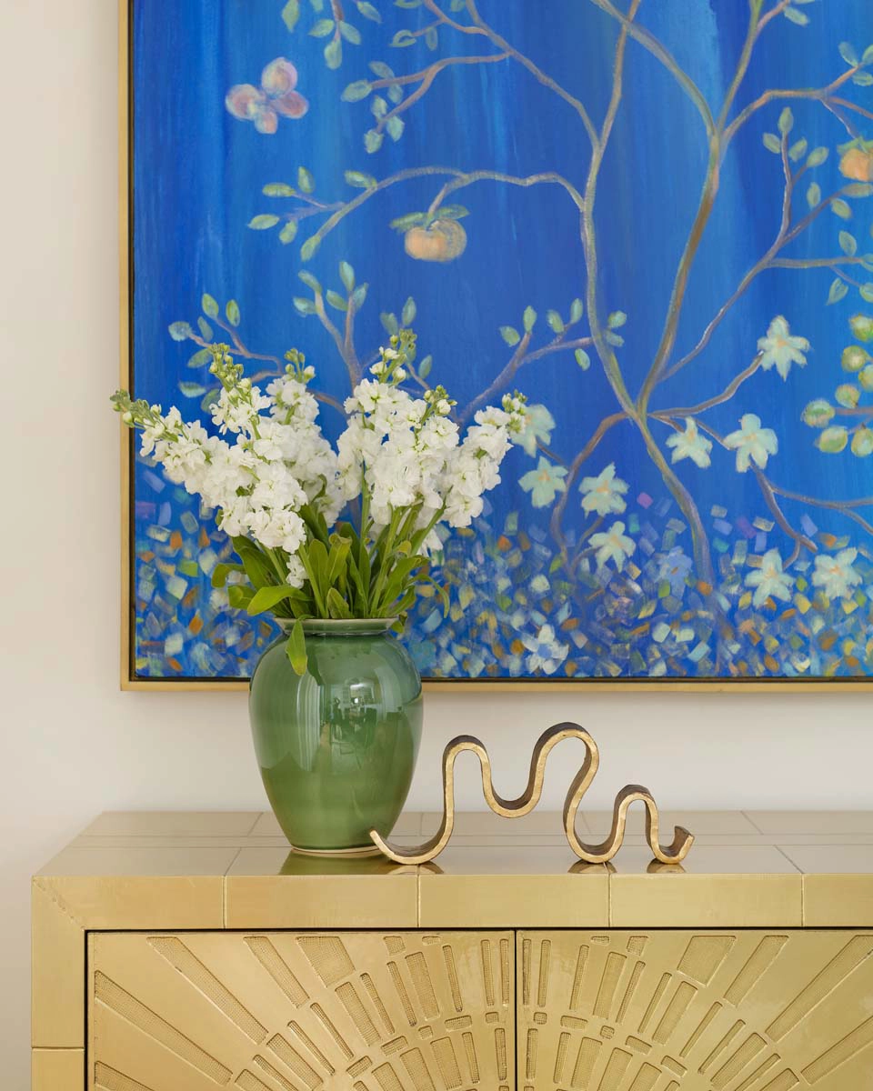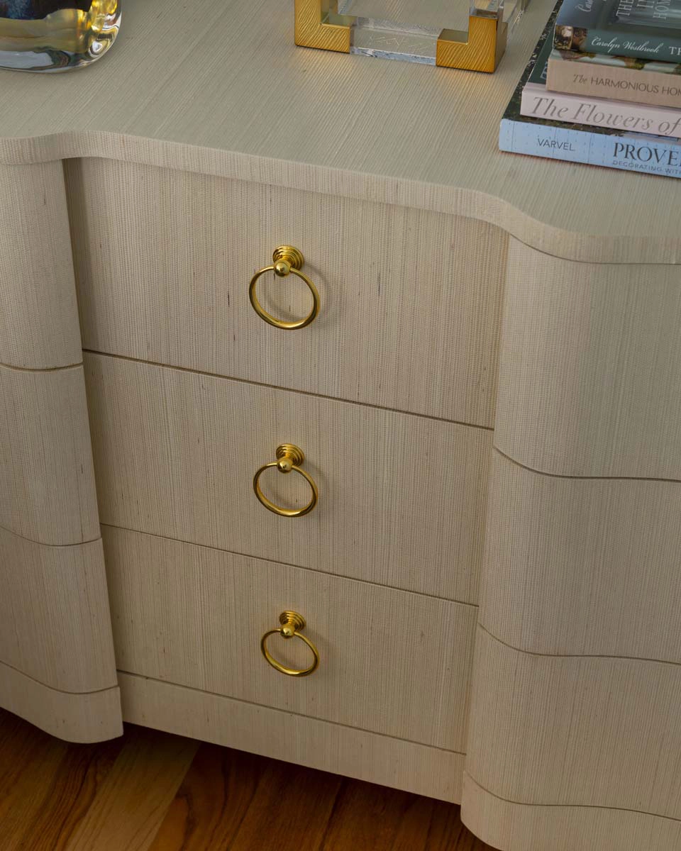 We leaned into this vision with bold, joyful design moments throughout the home. The powder bath sets the tone with a dramatic floral wallcovering, complemented by a bottle-glass chandelier and a coconut shell vanity mirror—an immersive nod to island style.