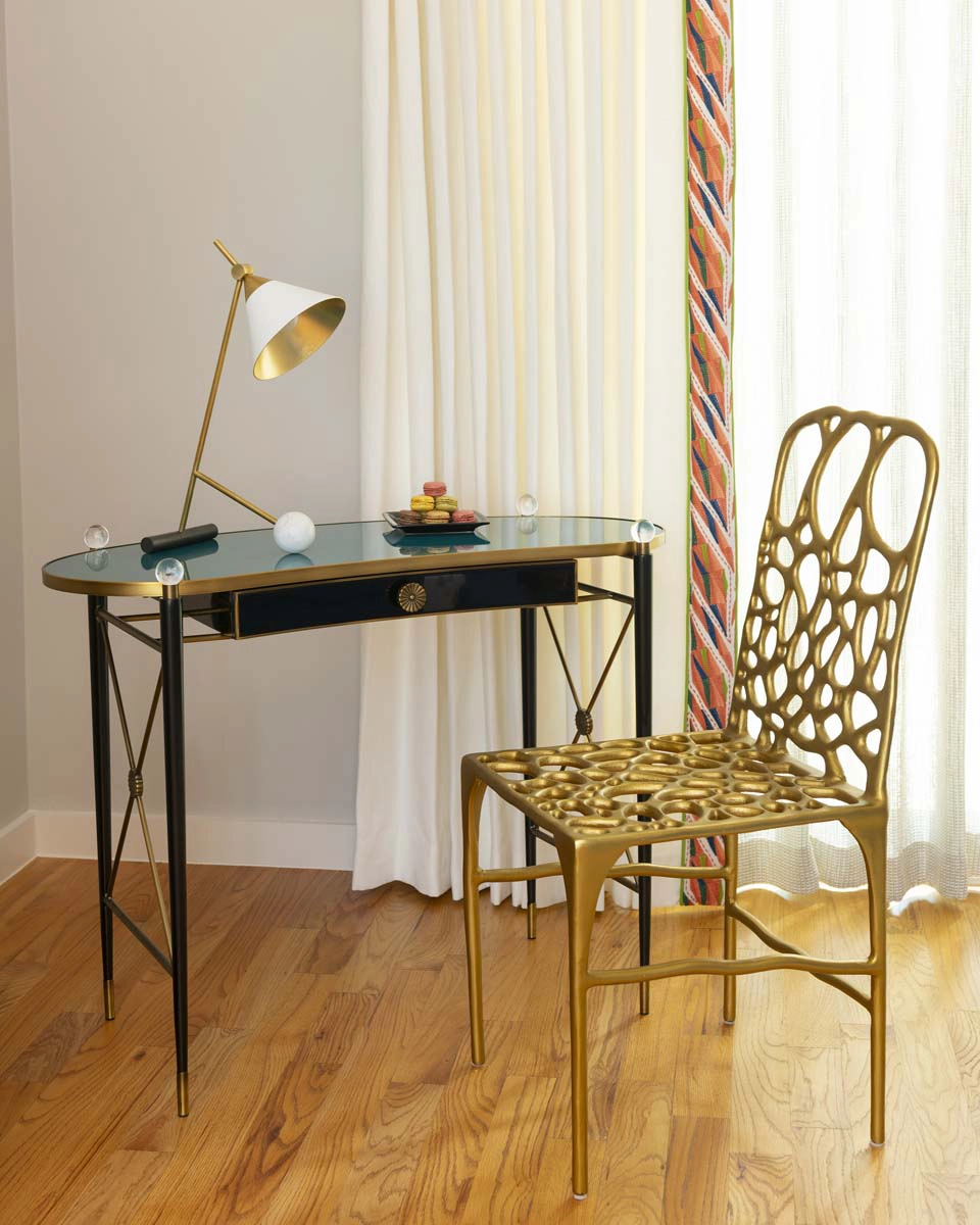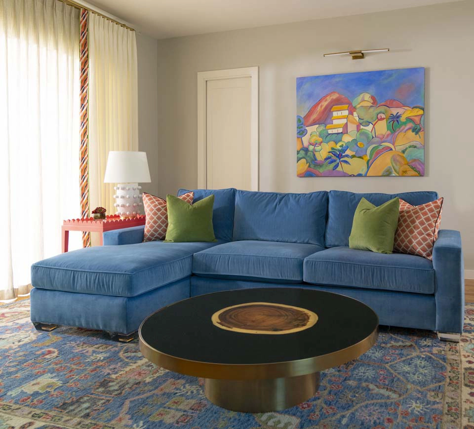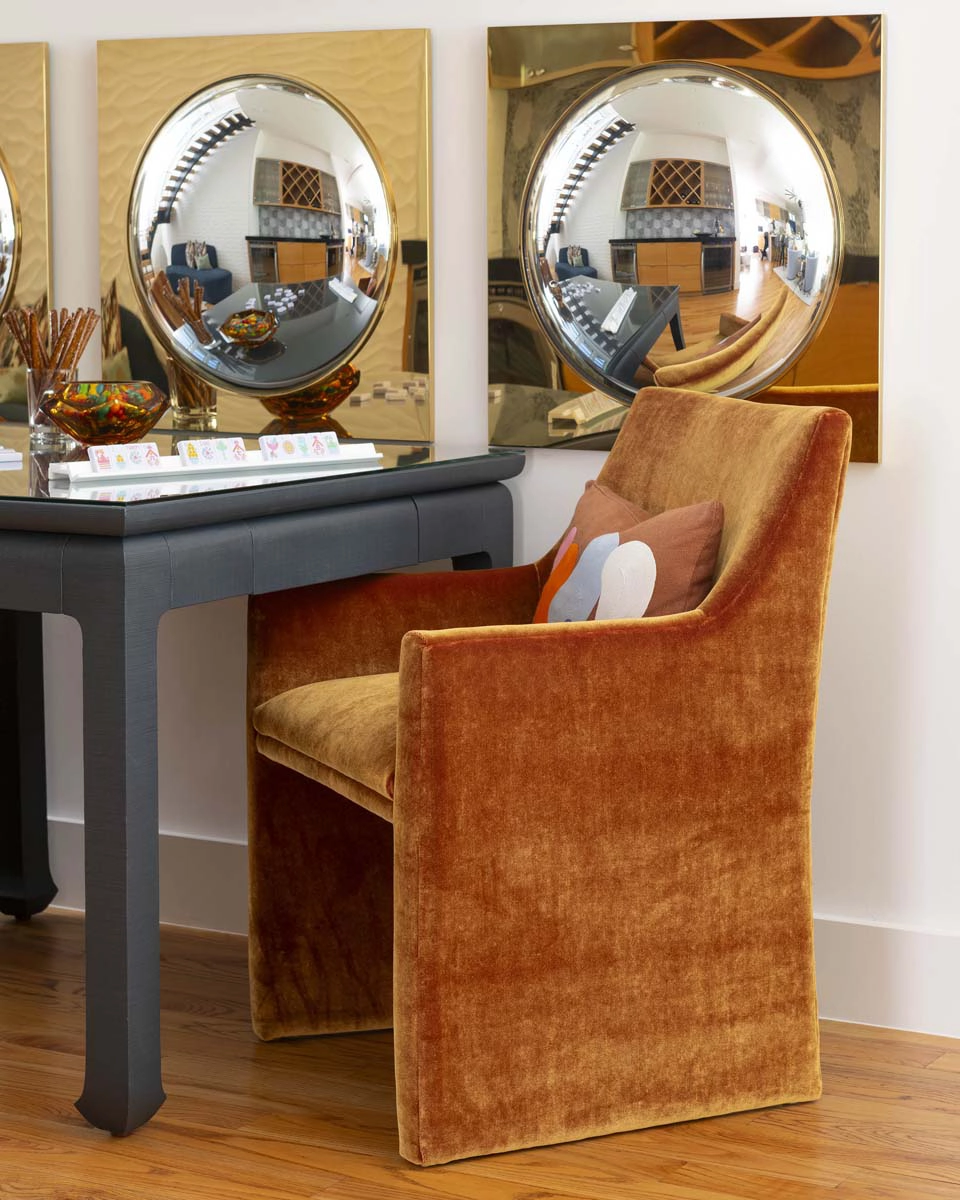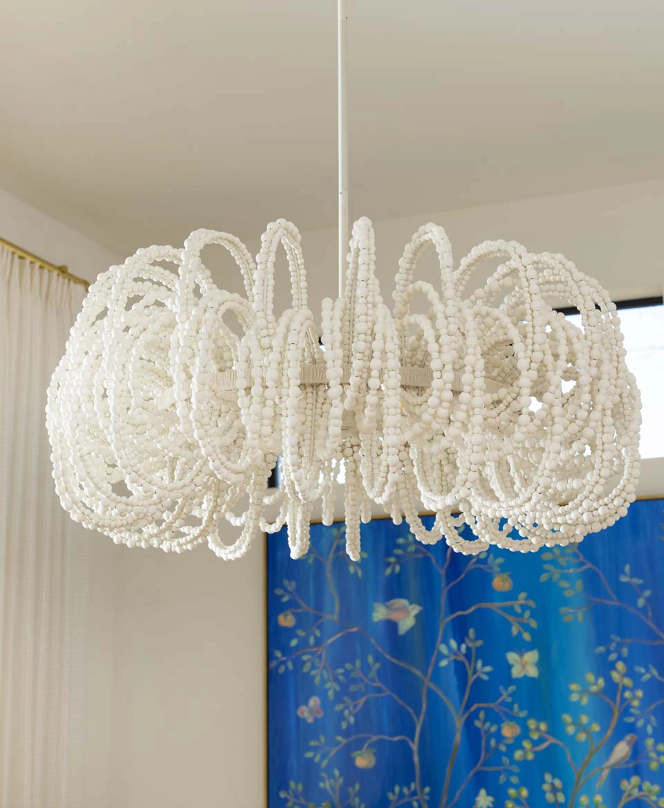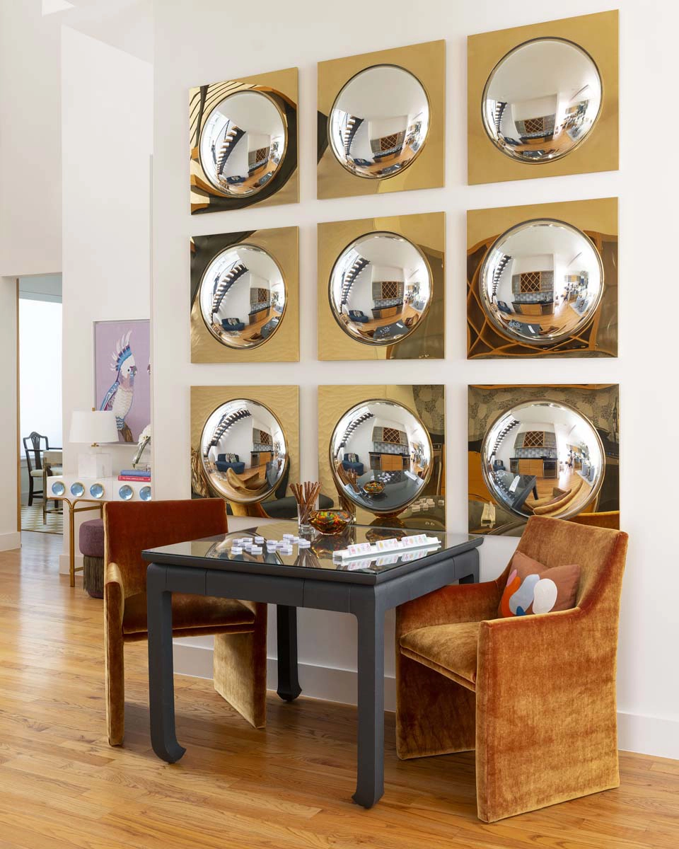Each bedroom carries its own vibrant personality, while textural details add playful sophistication across the home. Beaded artwork, a statement dining room chandelier and faux-mohair game chairs add layers of tactile interest and visual punctuation.