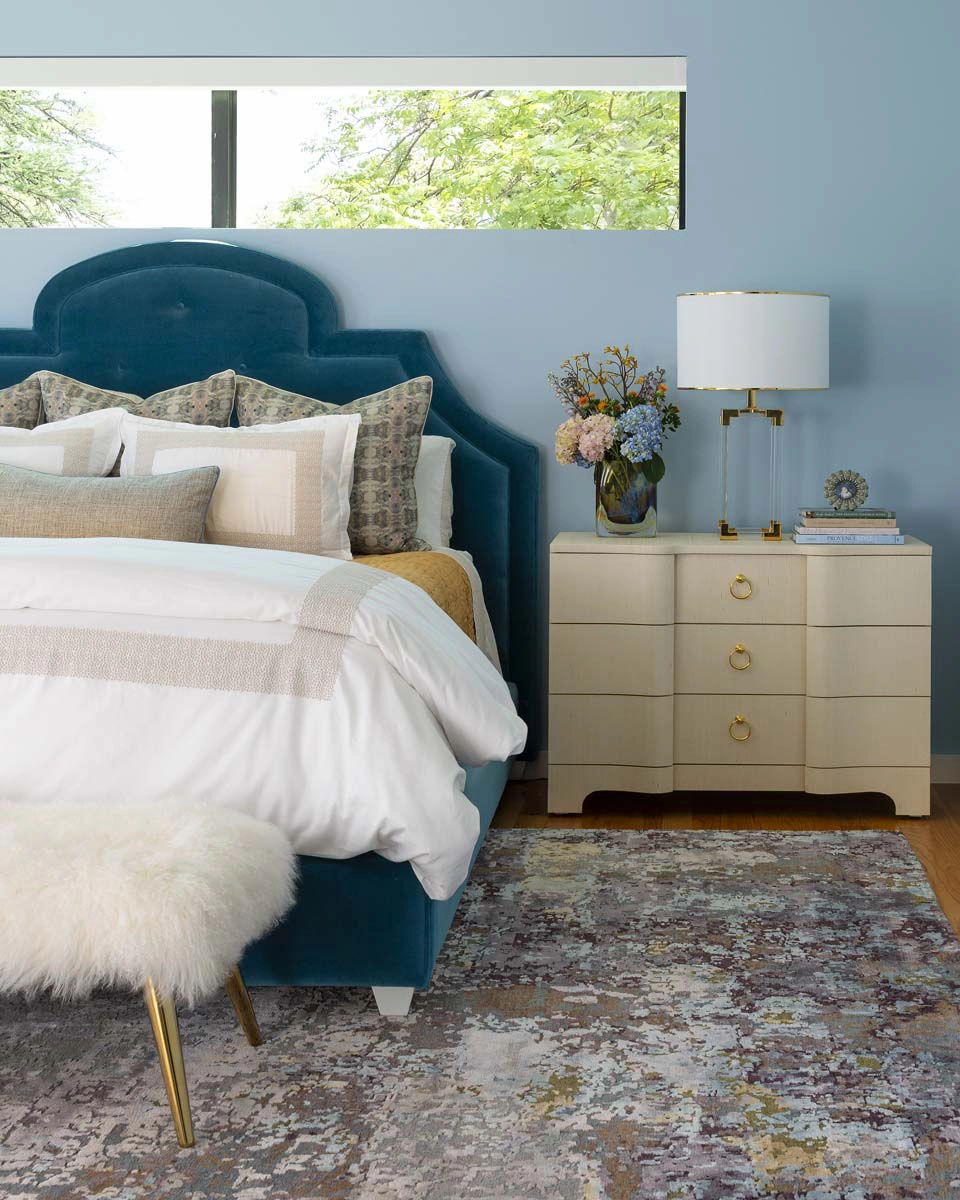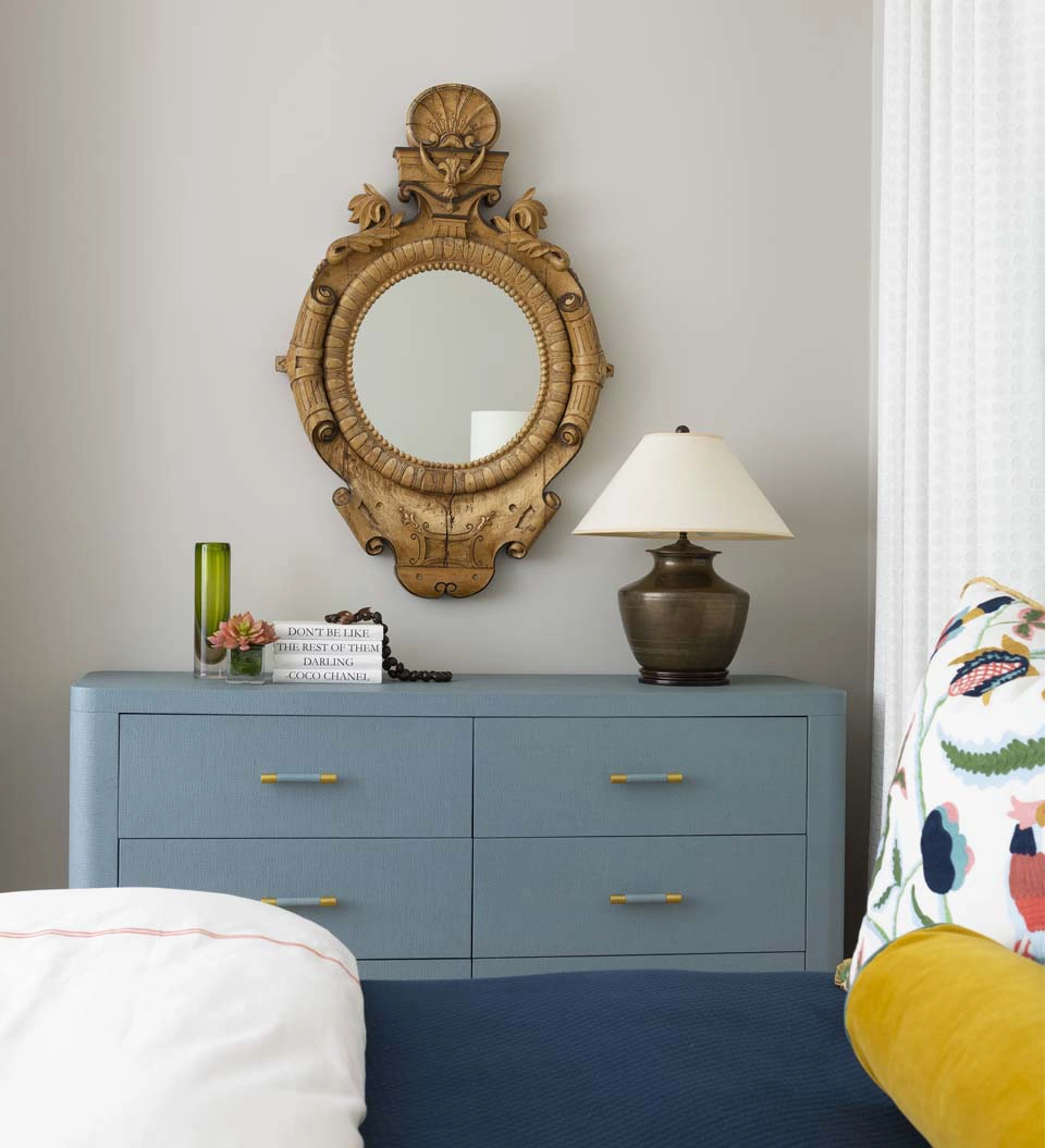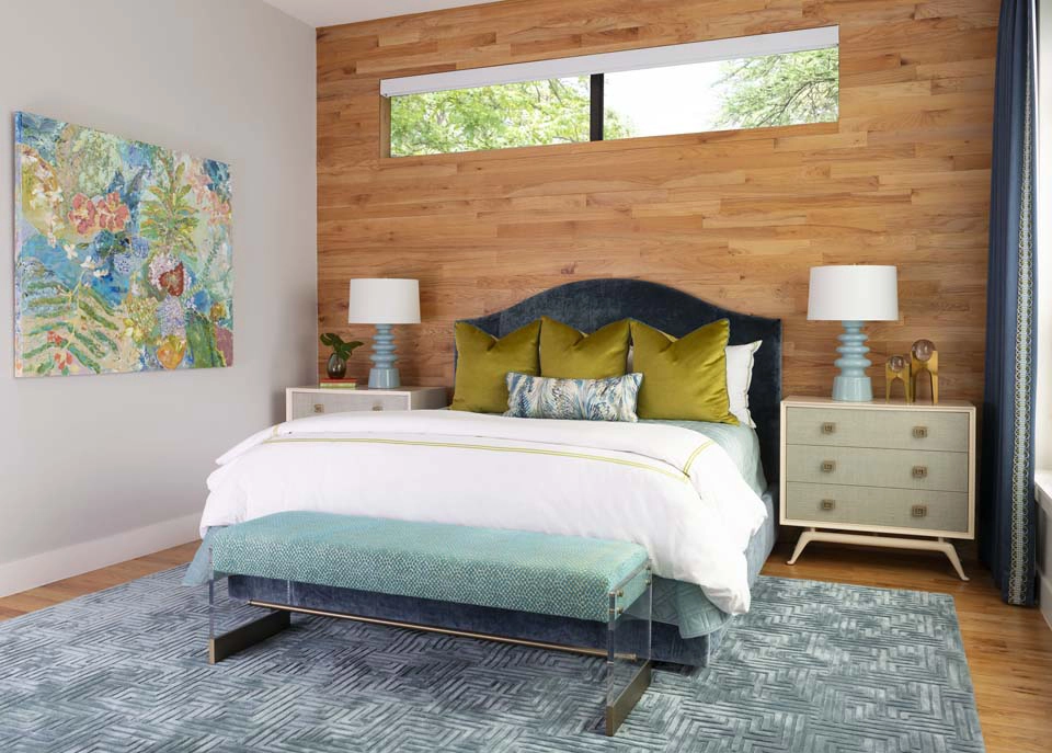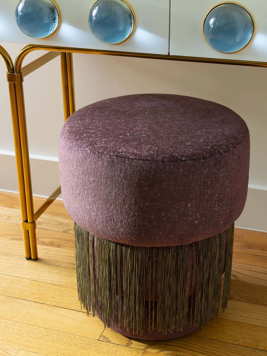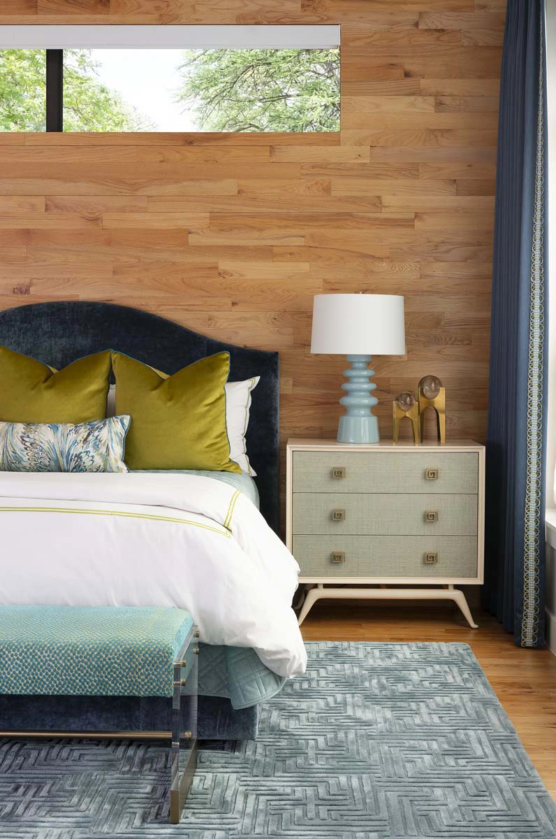 Each bedroom carries its own vibrant personality, while textural details add playful sophistication across the home. Beaded artwork, a statement dining room chandelier and faux-mohair game chairs add layers of tactile interest and visual punctuation.