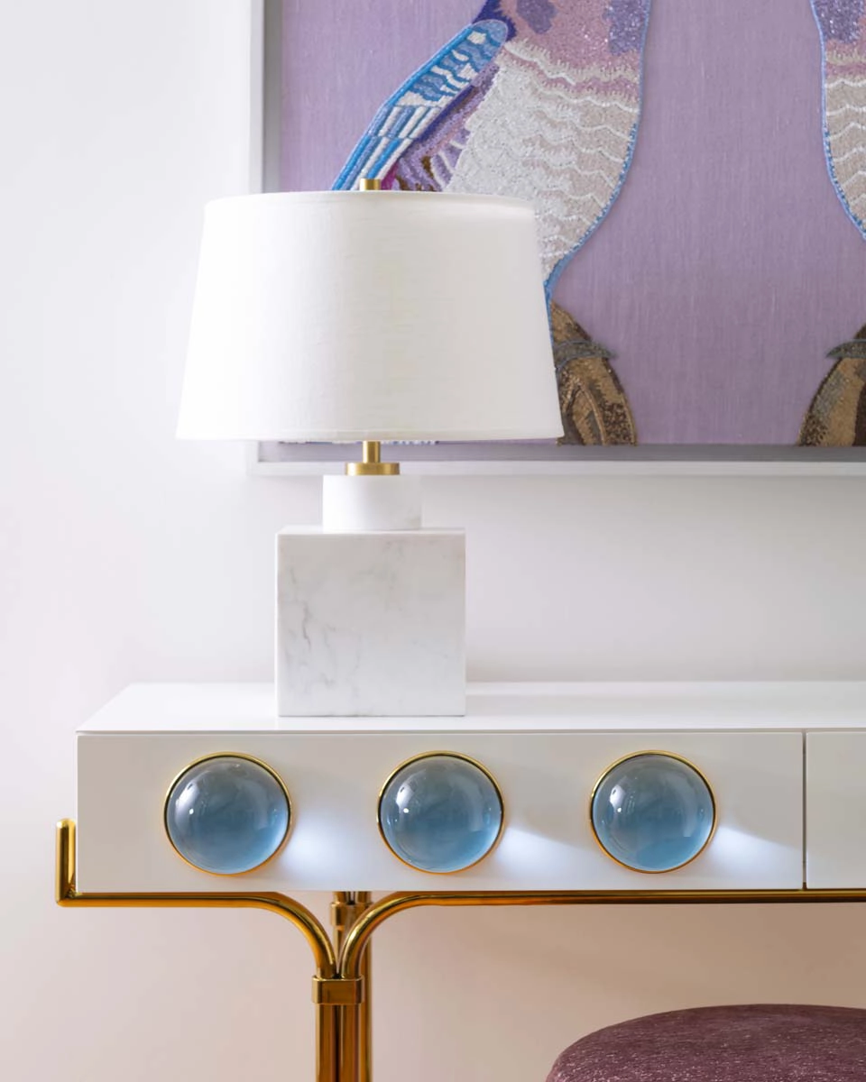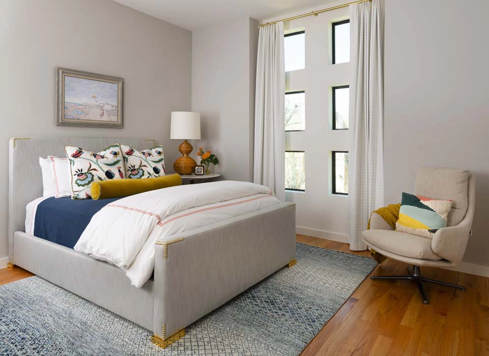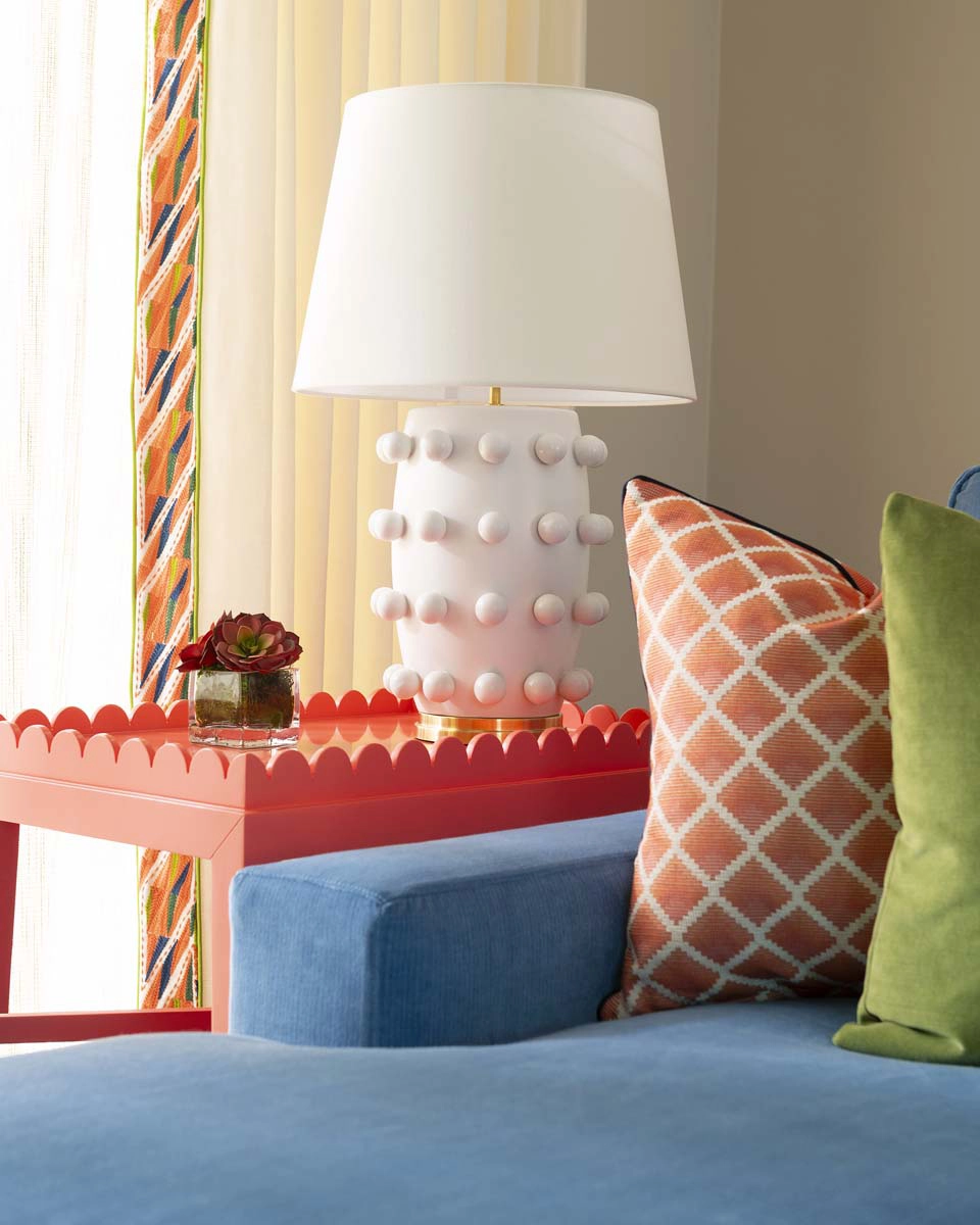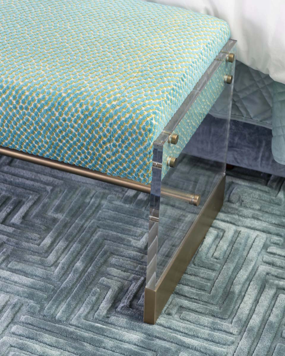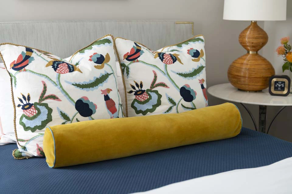 Each bedroom carries its own vibrant personality, while textural details add playful sophistication across the home. Beaded artwork, a statement dining room chandelier and faux-mohair game chairs add layers of tactile interest and visual punctuation.