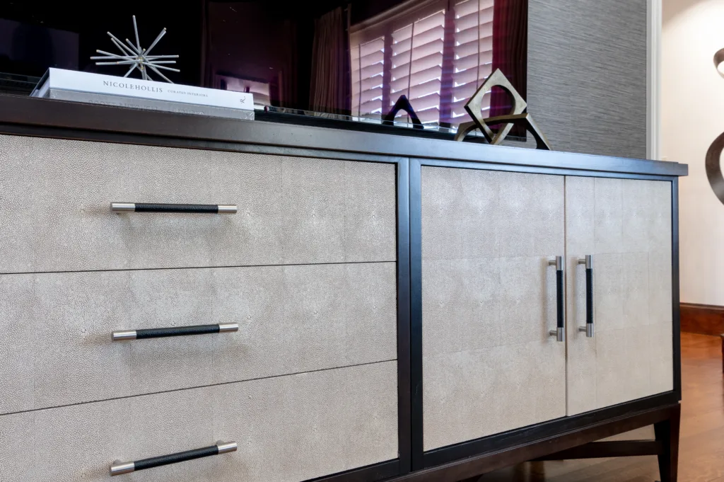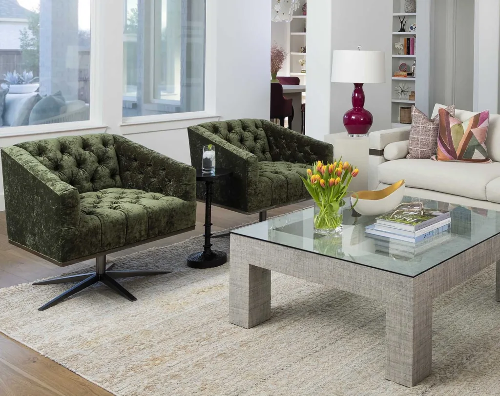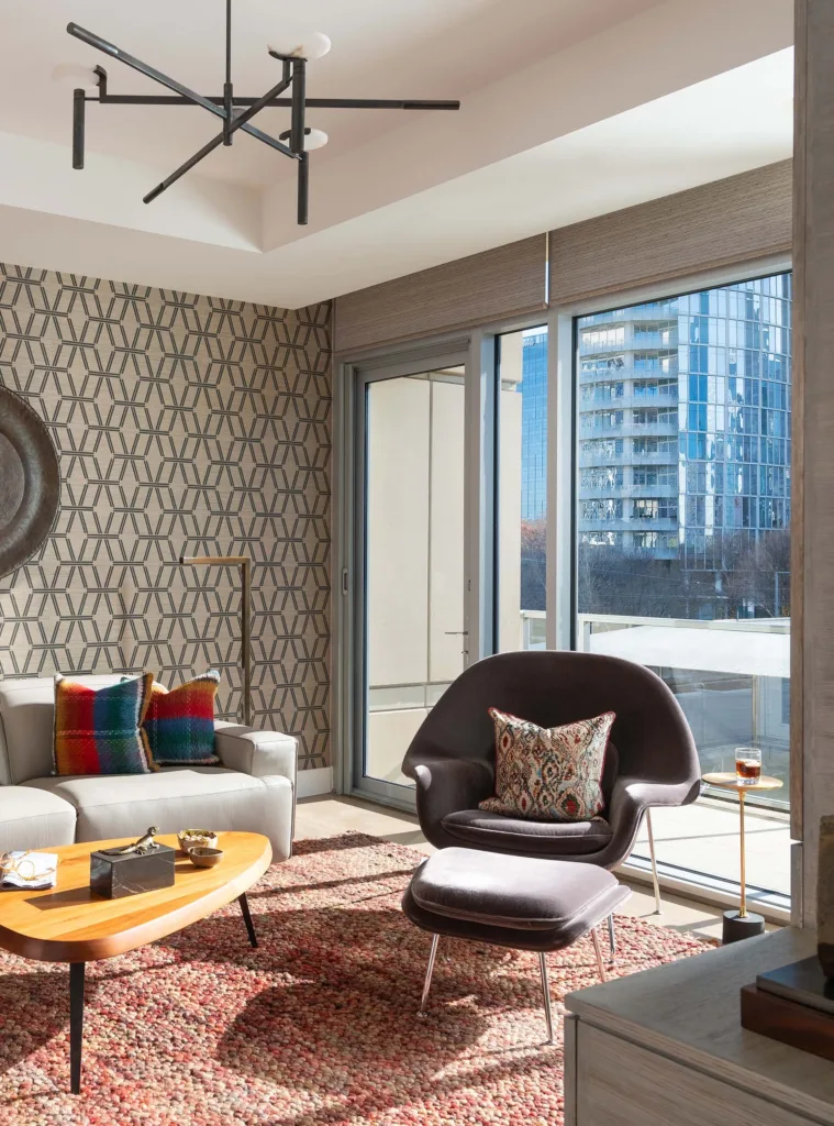 “When curating your MCM design, consider the patterns and specific colors you want to emphasize. I recommend earthy hues or muted tones vs. bright, bold colors. Have a favorite geometric shape? We can incorporate that into a meaningful pattern play. Cut velvets and tweeds are another staple I typically incorporate into mid-century modern designs to ensure depth and richness are achieved in the overall vibe of the room. I especially love incorporating a client’s family heirloom as a one-of-a-kind piece and nostalgic nod to their personal story.”